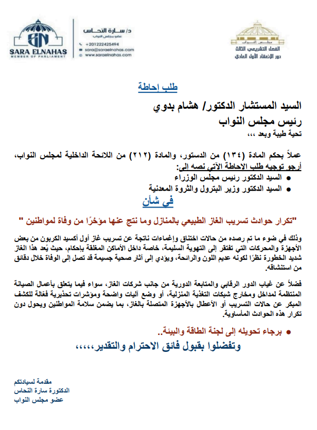عقب تكرار حوادث تسريب الغاز، في العديد من المدن في الجمهورية، تقدمت الدكتورة سارة النحاس، عضو مجلس النواب، بطلب إحاطة للدكتور مصطفى مدبولي، رئيس مجلس الوزراء، والمهندس كريم بدوي وزير البترول والثروة المعدنية، بشأن تكرار حوادث تسريب الغاز الطبيعي بالمنازل، وما نتج عنها مؤخرًا من وفاة لمواطنين".