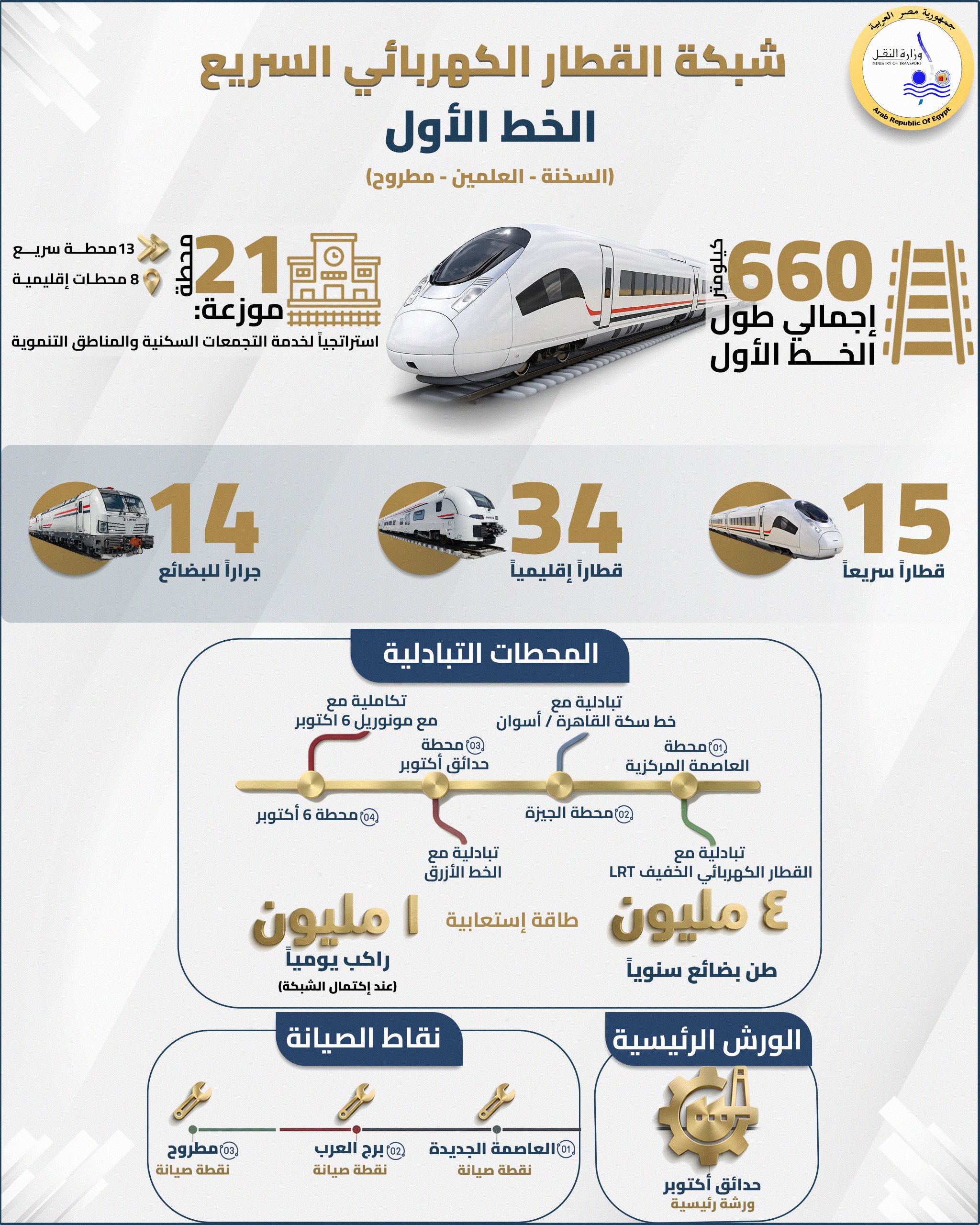 بحسب البيانات المعلنة عن المشروع، يمتد خط القطار الكهربائي السريع لمسافة تقارب 660 كيلومترا، رابطا بين مناطق استراتيجية تشمل الموانئ البحرية، والمدن الصناعية، والمراكز العمرانية الجديدة.