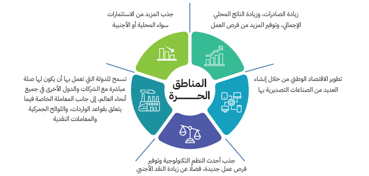 ووفق السردية الوطنية للتنمية الشاملة، تحظى المناطق الحرة باهتمام كبير لما لها من مردود إيجابي على الاقتصاد، إذ تسهم في جذب الاستثمارات، وزيادة الصادرات، ودعم الناتج المحلي الإجمالي، وتوفير فرص العمل، إلى جانب نقل التكنولوجيا الحديثة وتعزيز تدفقات النقد الأجنبي.