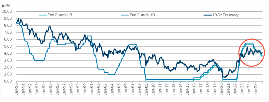 فعلى الرغم من ستة تخفيضات في أسعار الفائدة من قبل الاحتياطي الفيدرالي بإجمالي 175 نقطة أساس منذ انتهاء التشديد الكمي في منتصف عام 2024، لم ينخفض ​​عائد السوق على سندات الخزانة لأجل 10 سنوات إلا بنحو 35 نقطة أساس خلال تلك الفترة.