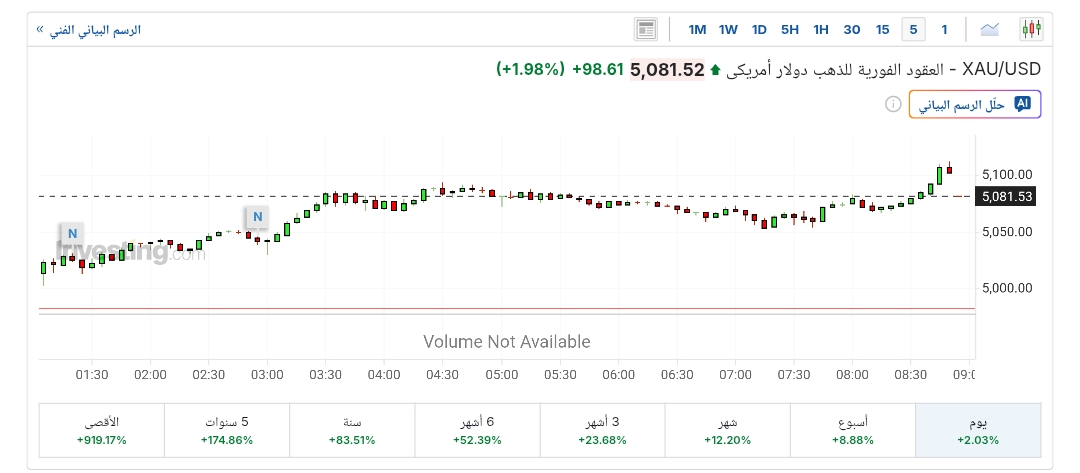 وفي المقابل، قفزت الأسعار الفورية للذهب بشكل غير مسبوق لتتخطى ولأول مرة حاجز الـ 5 آلاف دولار للأوقية، إذ ارتفعت بنسبة 2.03%، وتتداول حاليًا عند 5,081 دولارًا للأوقية، بعدما افتتحت التداولات عند 4,982 دولارًا، مسجلة أعلى مستوى لها عند 5,111 دولارًا، وأدنى مستوى عند 4,982 دولار، بحسب موقع «إنفيستينج».