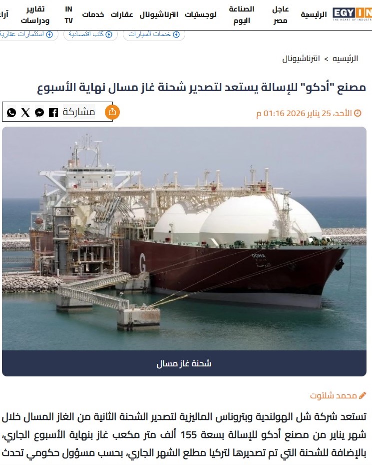 نشر موقع "إيجي إن"، أمس الأحد 25 يناير 2026، خبرًا صحفيًا جاء فيه أن شركة شل الهولندية وبتروناس الماليزية تستعد لتصدير الشحنة الثانية من الغاز المسال خلال شهر يناير من مصنع إدكو للإسالة بسعة 155 ألف متر مكعب غاز بنهاية الأسبوع الجاري، بالإضافة للشحنة التي تم تصديرها لتركيا مطلع الشهر الجاري، بحسب مسؤول حكومي تحدث لـ"إيجي إن" وطلب عدم نشر اسمه.