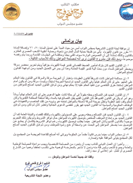 كما أكد النائب فرج، أن مجلس النواب حين ينظر مشروع قانونٍ مقدمًا من الحكومة، فإنه يزن الأمر بميزان المصلحة العامة، فإذا تبين أنه يخدم القاعدة العريضة من المجتمع، ويحمي استقرار الدولة، فإن واجبه الدستوري هو إقراره بعد النقاش والتدقيق.