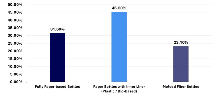 فمع تزايد الضغوط على شركات المشروبات لتقليل استخدام البلاستيك، تقدم الزجاجات الورقية بديلاً صديقاً للبيئة وجذاباً بصرياً، ويتعزز ريادة السوق بفضل ارتفاع حجم الاستهلاك والإطلاق المتكرر للمنتجات في عبوات مستدامة.