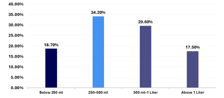 يعد هذا الحجم مثاليًا للاستخدام الفردي والتناول أثناء التنقل، إذ يحقق التوازن الأمثل بين سهولة الحمل والراحة والتحكم في الاستهلاك، وتأثرت هيمنته بشكل كبير بتفضيل المستهلكين لأحجام العبوات المتوسطة وتوافقها مع رفوف متاجر التجزئة.