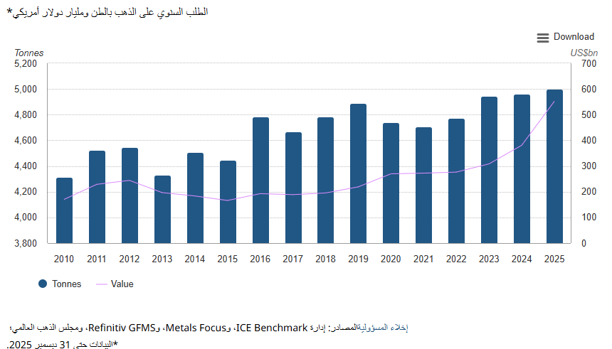 تجاوز إجمالي الطلب على الذهب في عام 2025، بما في ذلك المعروض خارج البورصة، 5 آلاف طن لأول مرة، وبالتزامن مع الارتفاع القياسي في سعر الذهب، الذي سجل 53 مستوى قياسياً جديداً خلال العام، بلغت قيمته الإجمالية 555 مليار دولار أمريكي، بزيادة قدرها 45% على أساس سنوي.