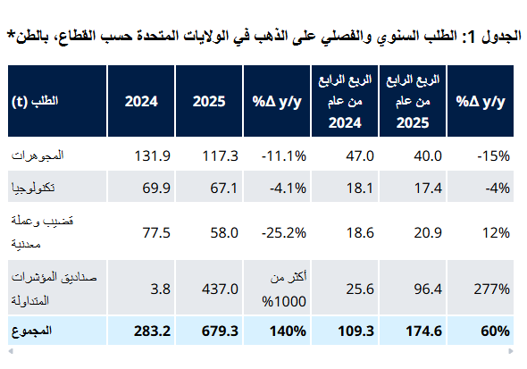 وبلغ إجمالي الطلب السنوي على الذهب في الولايات المتحدة نحو 679.3 طن بنهاية عام 2025، مقابل نحو 283.2 طن بنهاية عام 2024.