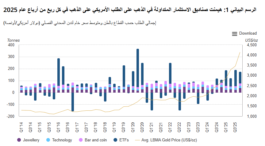 وساهم ارتفاع أسعار الذهب، الذي شهد 53 مستوى قياسياً جديداً، في خلق حلقة تغذية راجعة داعمة للطلب، حيث ارتفع الاستثمار في صناديق المؤشرات المتداولة (ETFs) بالتوازي مع ارتفاع سعر الذهب الأساسي.