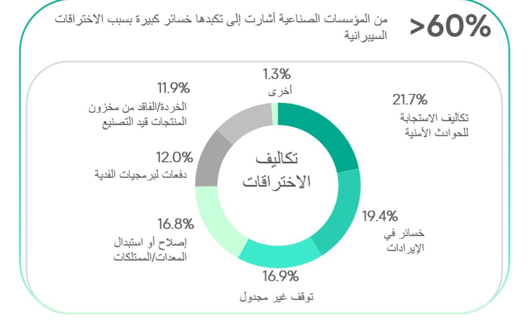 ووفقاً لدراسة أجرتها شركة VDC Research شملت 250 من صناع القرار في مجال تكنولوجيا التشغيل وتكنولوجيا المعلومات في قطاعات الطاقة والمرافق والنقل والخدمات اللوجستية وغيرها من القطاعات الصناعية، أفادت أكثر من 60% من الشركات الصناعية العام الماضي بأن اختراقات الأمن السيبراني قد تسببت في تكاليف باهظة.