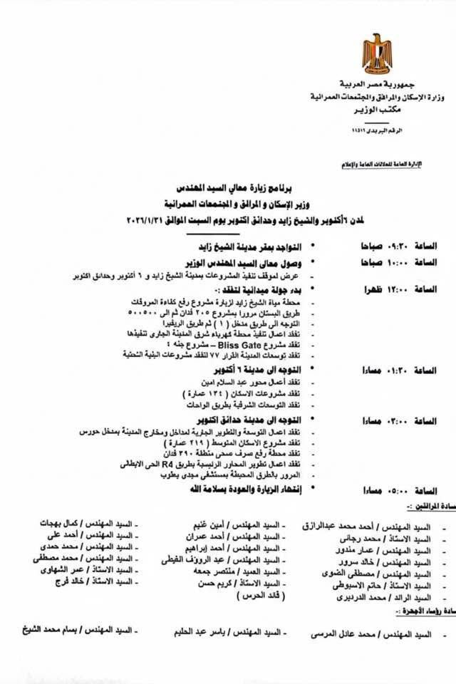 يتوجه الوزير إلى مدينة 6 أكتوبر ليتفقد أعمال محور عبد السلام أمين ثم يتفقد مشروعات الإسكان (134 عمارة)، وبعدها يقوم الوزير بتفقد التوسعات الشرقية بطريق الواحات.