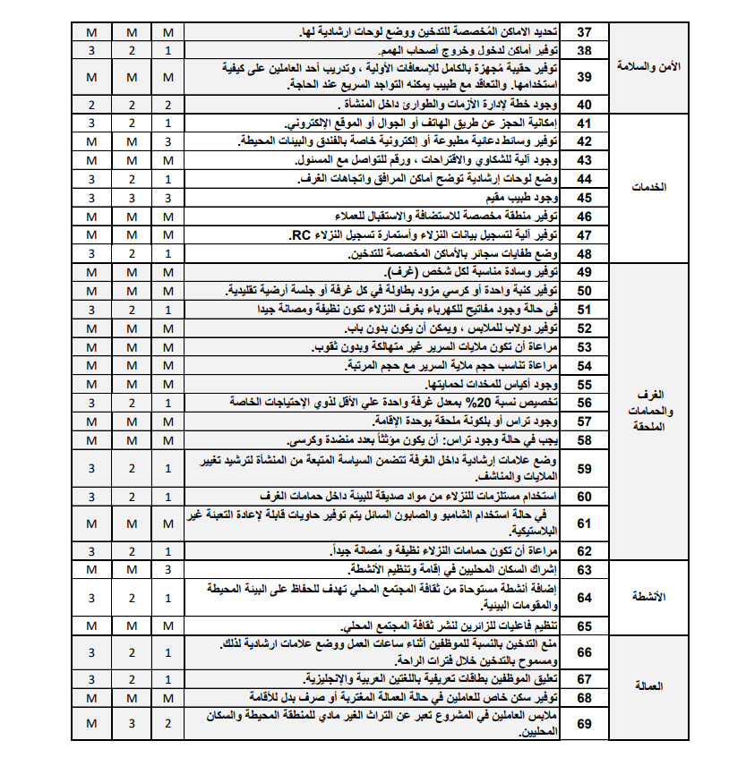 وأفادت الضوابط، أن في حالة استخدام الكهرباء يتم مراقبة استهلاك الطاقة بحيث لا يزيد معدل استهلاك الفرد على 25 كيلو وات/ساعة/يوم، وفي حالة استخدام الكهرباء يتم تسجيل استهلاك الطاقة أسبوعياً، وتركيب أدوات ترشيد المياه بدورات المياه والمطبخ وحمامات الغرف.