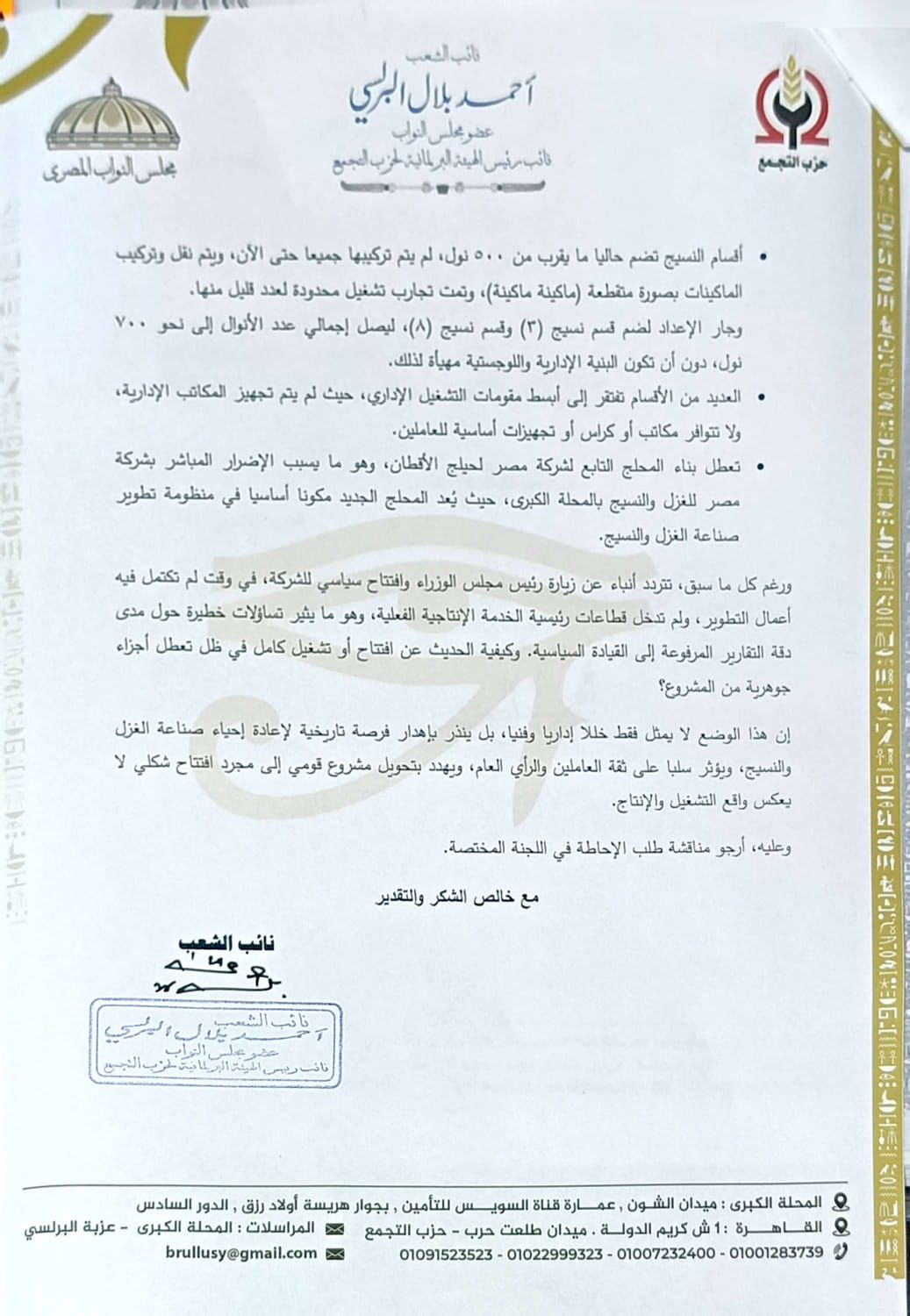 واختتم النائب طلبه قائلًا “ إن هذا الوضع لا يمثل فقط خللا إداريًا وفنيًا، بل ينذر بإهدار فرصة تاريخية لإعادة إحياء صناعة الغزل والنسيج، ويؤثر سلبًا على ثقة العاملين والرأي العام، ويهدد بتحويل مشروعٍ قومي إلى مجرد افتتاحٍ شكلي لا يعكس واقع التشغيل والإنتاج، وعليه أرجو مناقشة طلب الإحاطة في اللجنة المختصة”.