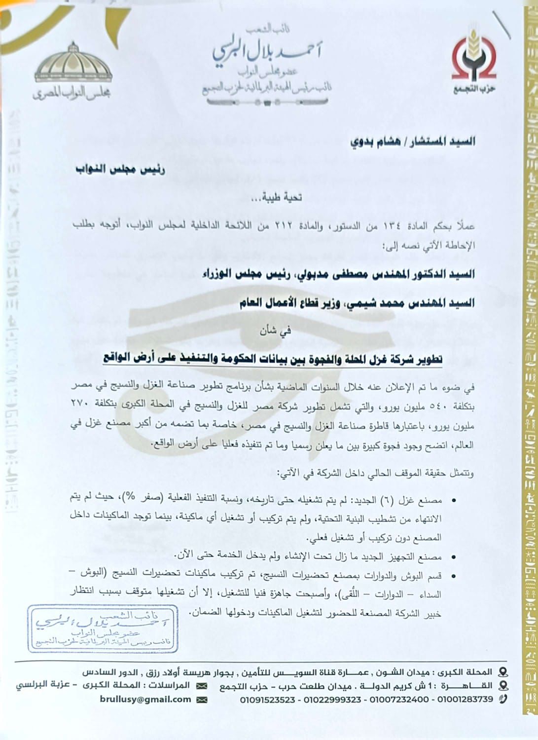 وعملًا بحكم المادة 134 من الدستور، والمادة 212 من اللائحة الداخلية لمجلس النواب، أتوجه بطلب الإحاطة الآتي نصه إلى الدكتور المهندس مصطفى مدبولي، رئيس مجلس الوزراء، والمهندس محمد شيمي، وزير قطاع الأعمال العام، في شأن تطوير شركة غزل المحلة والفجوة بين بيانات الحكومة والتنفيذ على أرض الواقع.