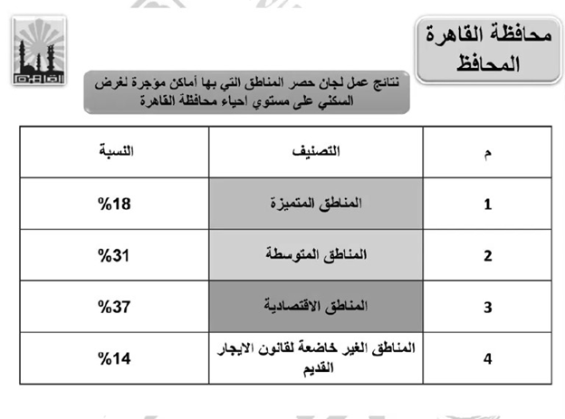 وأظهرت نتائج لجان حصر المناطق التي بها أماكن مؤجرة للغرض السكني على مستوى أحياء محافظة القاهرة، استحواذ المناطق المتميزة على نسبة 18%، والمناطق المتوسطة على نسبة 31%، والمناطق الاقتصادية على نسبة 37%، أما المناطق غير الخاضعة لقانون الإيجار القديم بنسبة 14%.