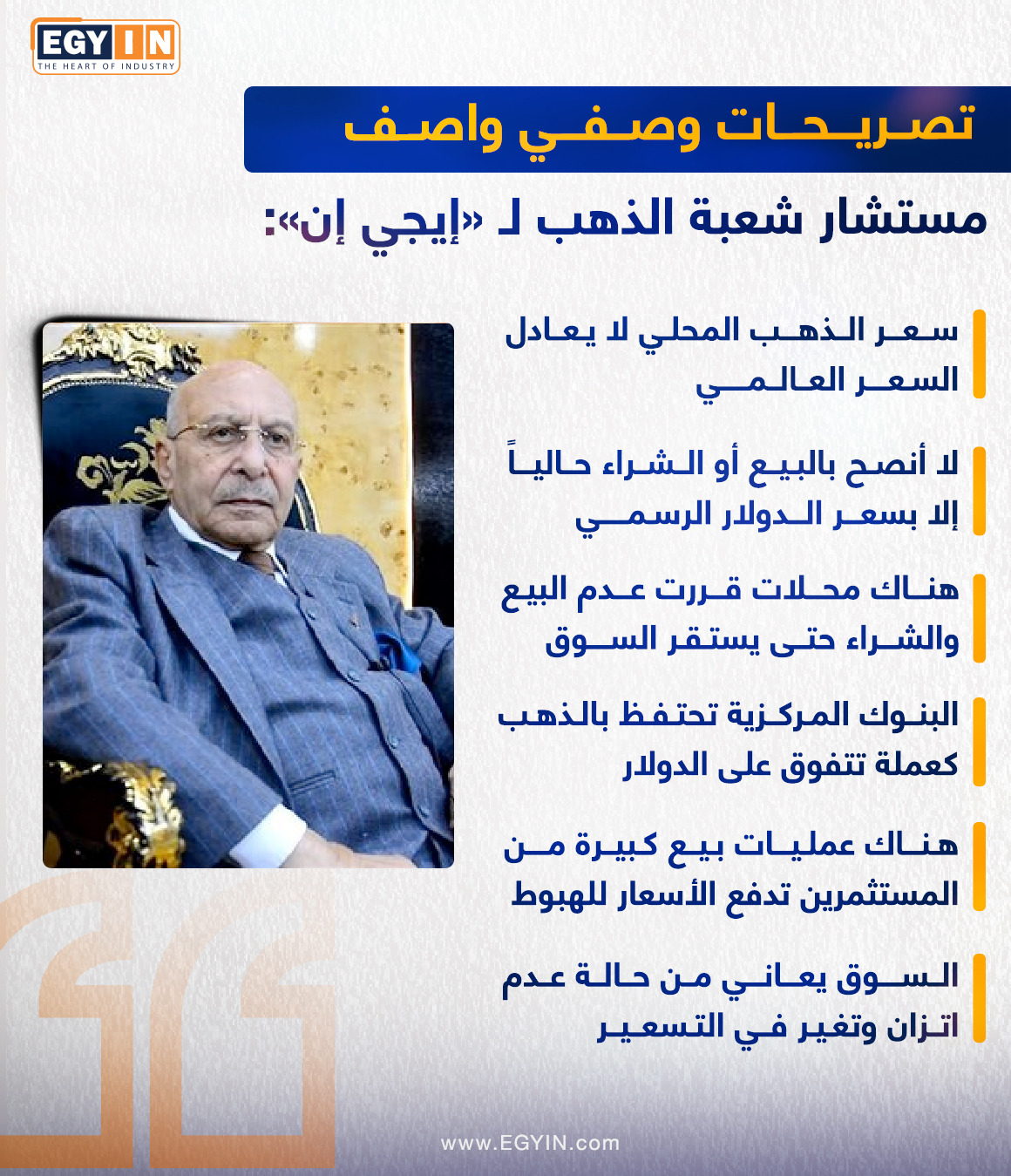 وأضاف “واصف” خلال تصريحات خاصة لموقع «إيجي إن»، أنه لا ينصح تمامًا بالشراء أو البيع خلال الفترة الحالية إلا بسعر الدولار الرسمي، لحين استقرار الأوضاع ومعرفة مسار الذهب خلال الفترة المقبلة.