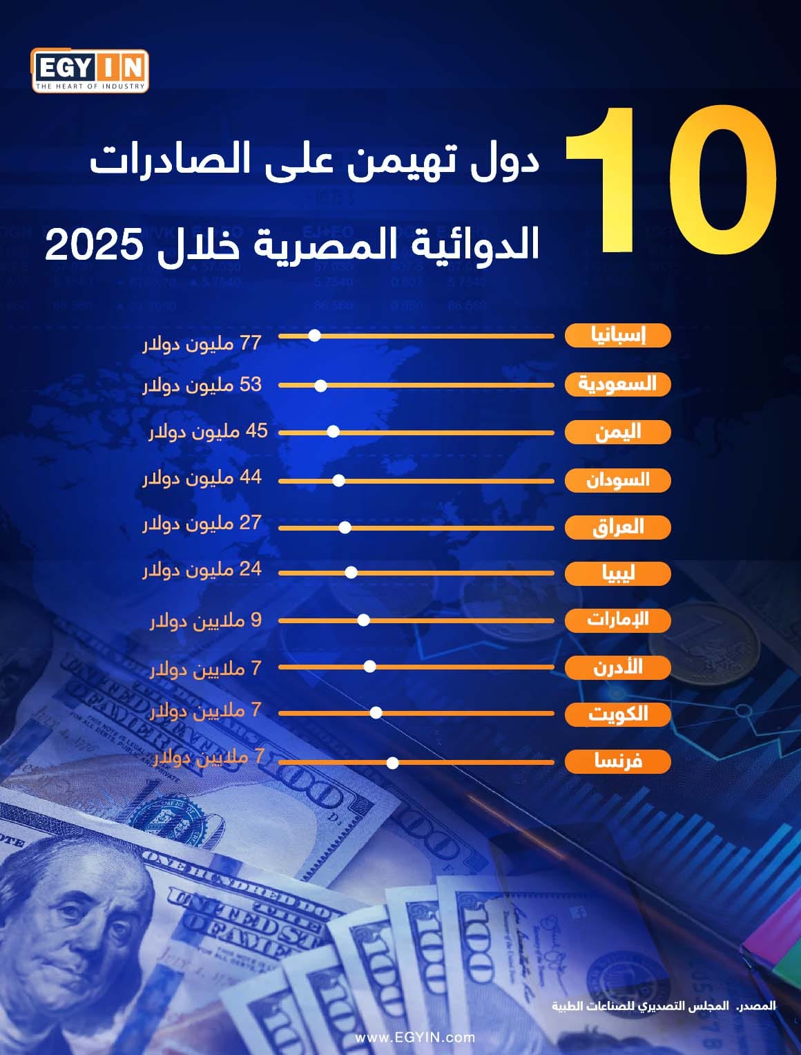 10 دولٍ تهيمن على الصادرات الدوائية المصرية خلال 2025 (إنفوجراف)