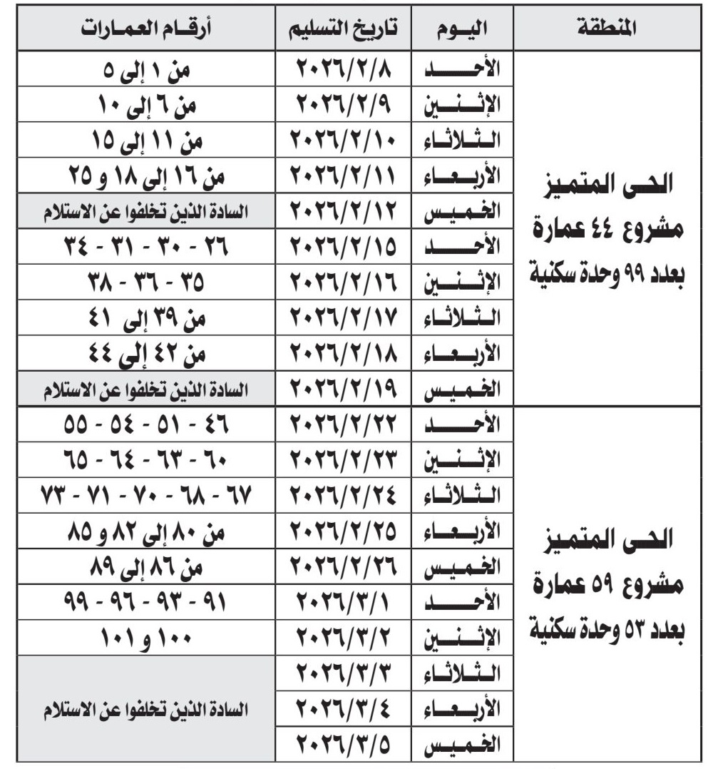 جدول مواعيد تسليم 152 وحدة سكنية بمشروع بيت الوطن في دمياط الجديدة
