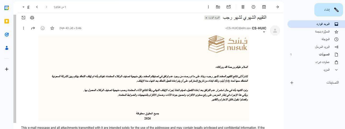 وتضمن الإشعار تنبيهًا باتخاذ إجراء الإيقاف النهائي في حال استمرار عدم التوافق بعد إعادة التفعيل، وذلك وفقًا لنتائج الأداء المعتمدة، في إطار رفع مستوى الالتزام وتحسين جودة الأداء، وضمان تطبيق الضوابط المعمول بها.