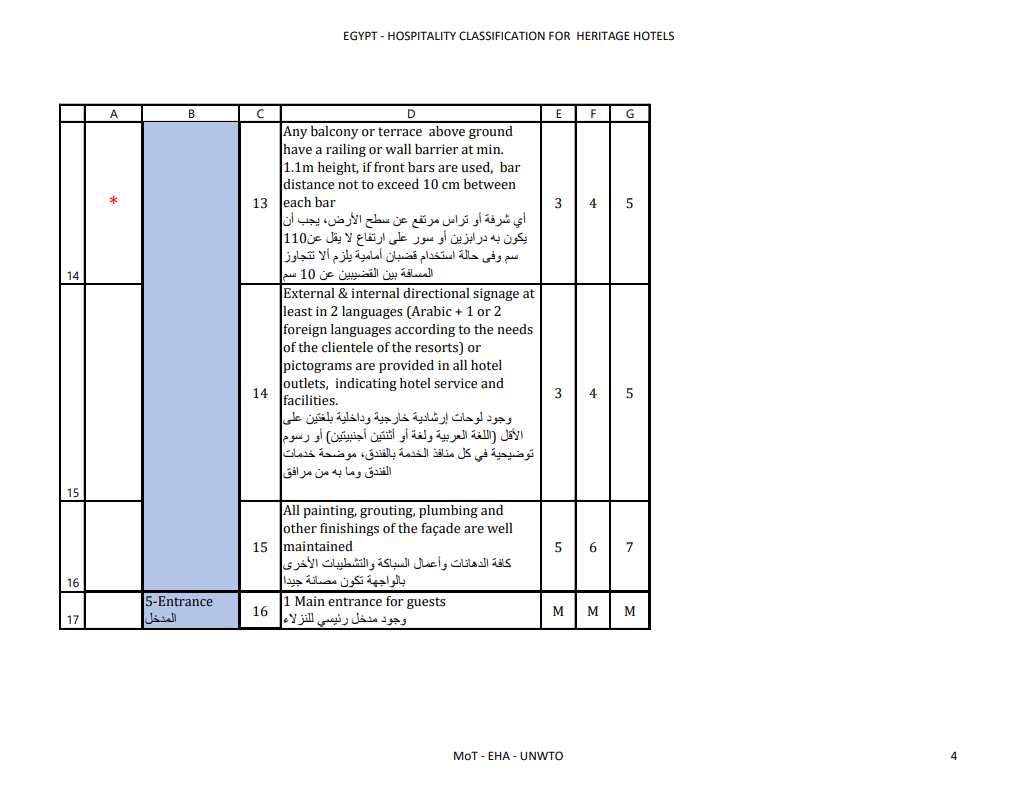 وشملت وجود لوحات إرشادية خارجية وداخلية بلغتين على الأقل "العربية ولغة آخري"، أو رسوم توضيحية فى كل منافذ الخدمة بالفندق، موضحة خدمات الفندق وما به من مرافق، بالإضافة إلى كافة الدهانات وأعمال السباكة والتشطيبات الآخري بالواجهة تكون مصانة جيداً.