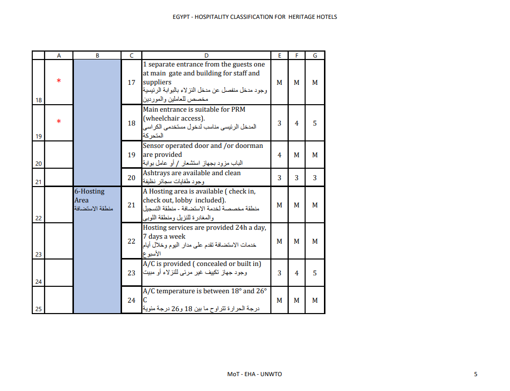 وتضمنت وجود جهاز تكييف غير مرئي للنزلاء أو مبيت بدرجة حرارة تتراوح ما بين 18 و26 درجة مئوية، واعلان الأسعار الرسمية للغرف المعتمدة من وزارة السياحة والآثار تكون مرئية للنزيل سواء بالمكتب الأمامى أو على الباب الرئيسي، بالإضافة إلى وجود خدمة استبدال العملة سواء عن طريق بنك أو خدمة الصراف الآلى التى تقبل الكروت الدولية داخل الفندق.