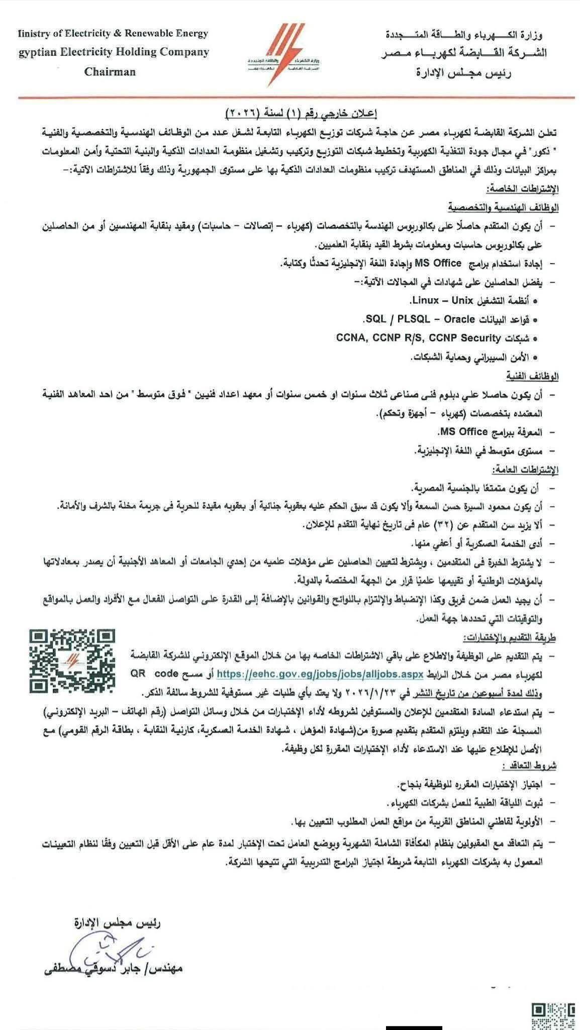 تواصل الشركة القابضة لكهرباء مصر استقبالها لطلبات التقديم، على عدد من الوظائف الهندسية والتخصصية والفنية، في مجال جودة التقنية الكهربية، وتخطيط شبكات التوزيع، وتركيب وتشغيل منظومة العدادات الذكية والبنية التحتية وأمن المعلومات بمراكز البيانات، وذلك في المناطق المستهدف تركيب منظومات العدادات الذكية بها على مستوى الجمهورية.