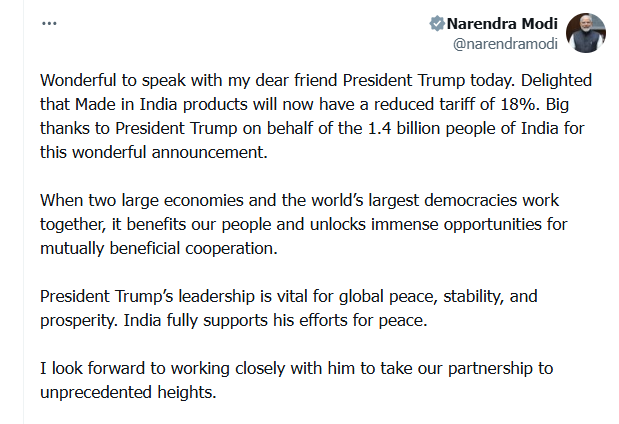 وأشاد رئيس الوزراء الهندي ناريندرا مودي بهذا الإعلان قائلا:" كان من دواعي سروري التحدث اليوم مع صديقي العزيز الرئيس ترامب، يسعدني أن المنتجات المصنعة في الهند تخضع الآن لرسوم جمركية مخفضة بنسبة 18%، شكرًا جزيلًا للرئيس ترامب نيابةً عن 1.4 مليار نسمة من سكان الهند على هذا الإعلان الرائع".