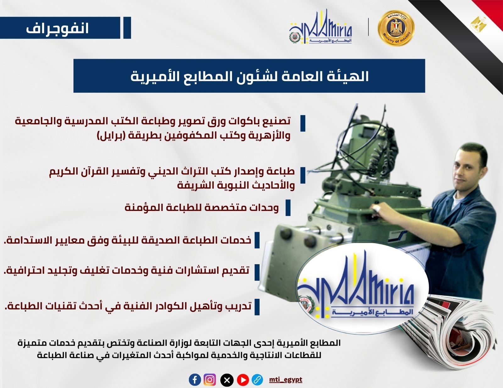 تواصل الهيئة العامة لشؤون المطابع الأميرية، التابعة لوزارة الصناعة، دورها الريادي كأحد أعرق المؤسسات الطباعية في منطقة الشرق الأوسط، من خلال تقديم حزمة متكاملة من الخدمات المتميزة للقطاعات الإنتاجية والخدمية.