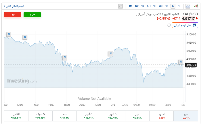 وتراجعت الأسعار الفورية للذهب مرة أخرى لتفشل في الصعود، منخفضة بنسبة 0.9%، ليتم تداولها حاليًا عند 4917 دولارًا للأوقية، بعدما افتتحت التداولات عند 4,964، مسجلة أعلى مستوى لها عند 5,023 دولار، بحسب موقع «إنفيستينج».