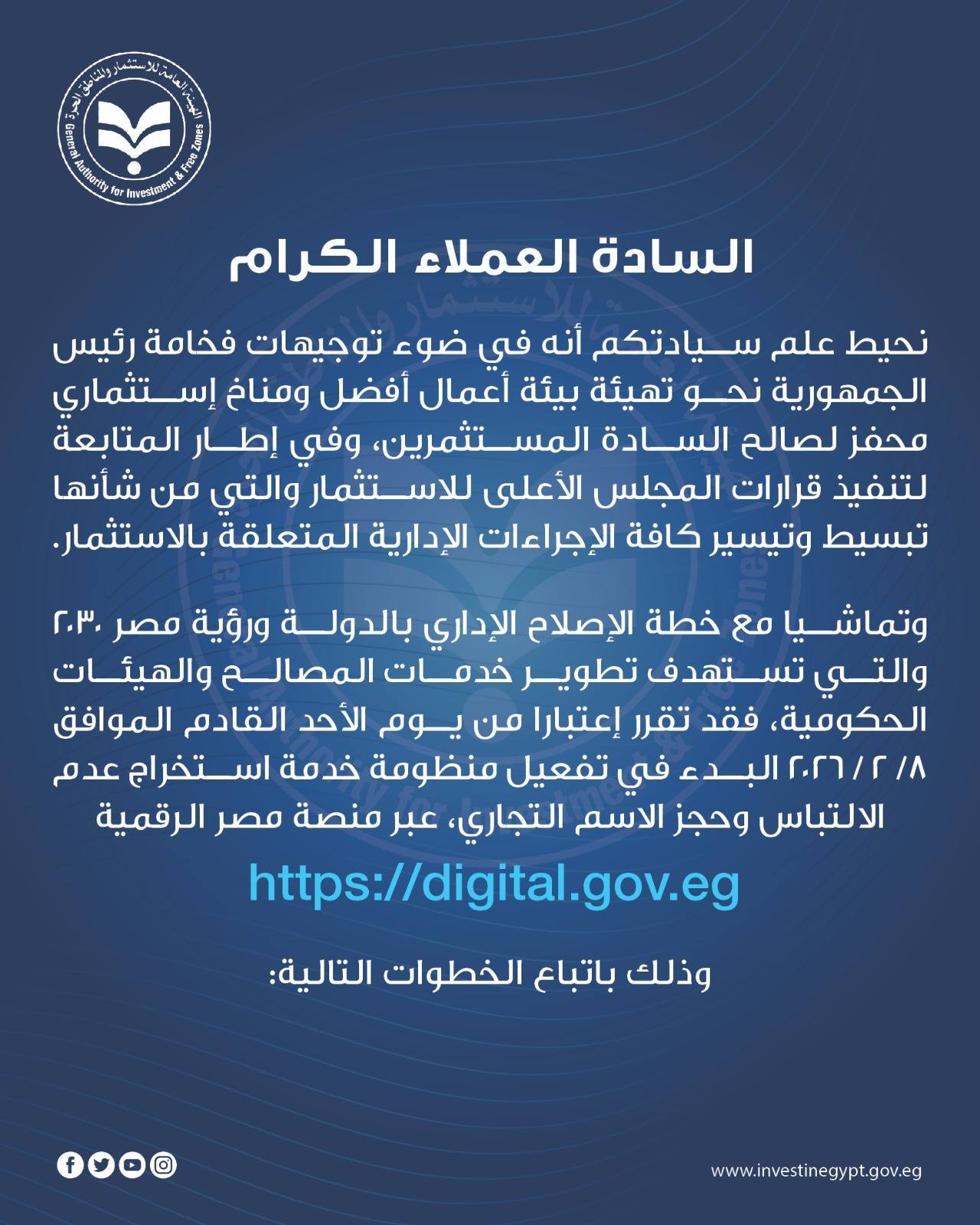 أعلنت الهيئة العامة للاستثمار والمناطق الحرة، بالتعاون مع جهاز تنمية التجارة الداخلية، عن تفعيل منظومة استخراج شهادة عدم الالتباس وحجز الاسم التجاري إلكترونيًا عبر بوابة مصر الرقمية، اعتبارًا من 8 فبراير 2026.