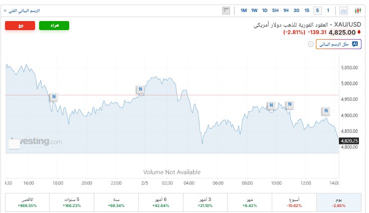 وتراجعت الأسعار الفورية للذهب مرة أخرى لتفشل في الصعود، منخفضة بنسبة 2.8%، ليتم تداولها حاليًا عند 4825 دولارًا للأوقية، بعدما افتتحت التداولات عند 4,964، مسجلة أعلى مستوى لها عند 5,023 دولار، بحسب موقع «إنفيستينج».