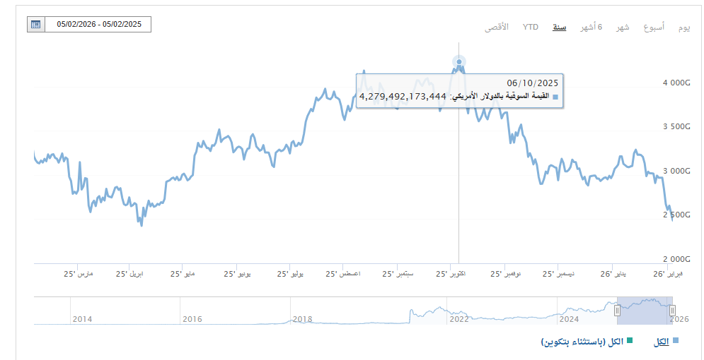 وانعكس الهبوط الحاد على القيمة السوقية الإجمالية للعملات الرقمية، التي تراجعت من 4.27 تريليون دولار مطلع أكتوبر إلى نحو 2.48 تريليون دولار اليوم، بخسائر تجاوزت 1.7 تريليون دولار وبنسبة تقارب 40%، في واحدة من أكبر موجات التراجع منذ ذروة السوق.