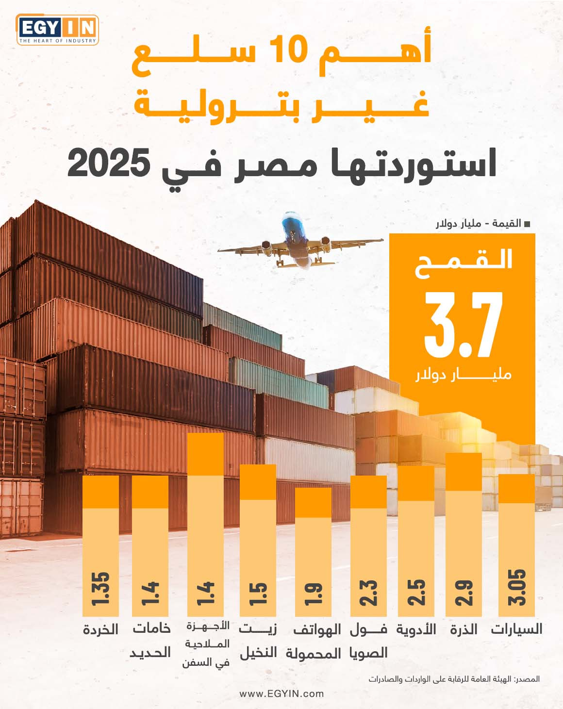بين القمح والسيارات والهواتف، تعرف على السلع الـ 10 الأكثر استيرادًا في مصر (إنفوجراف)