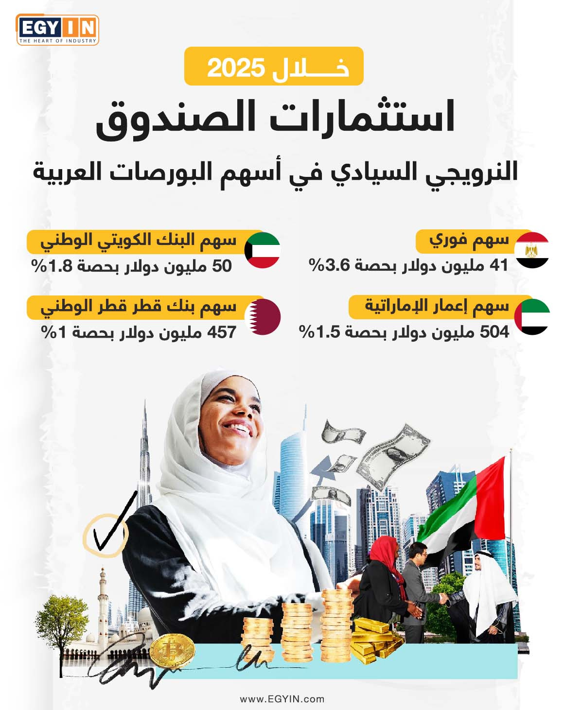 وبالنسبة إلى نمو استثمارات "الصندوق النرويجي السيادي" في البورصات العربية في 2025، جاءت مصر في الصدارة بنسبة 30% نموًا في حصة تداولات الصندوق، والكويت بنسبة 15%، والإمارات بنسبة 12%، وقطر بنسبة 4%.