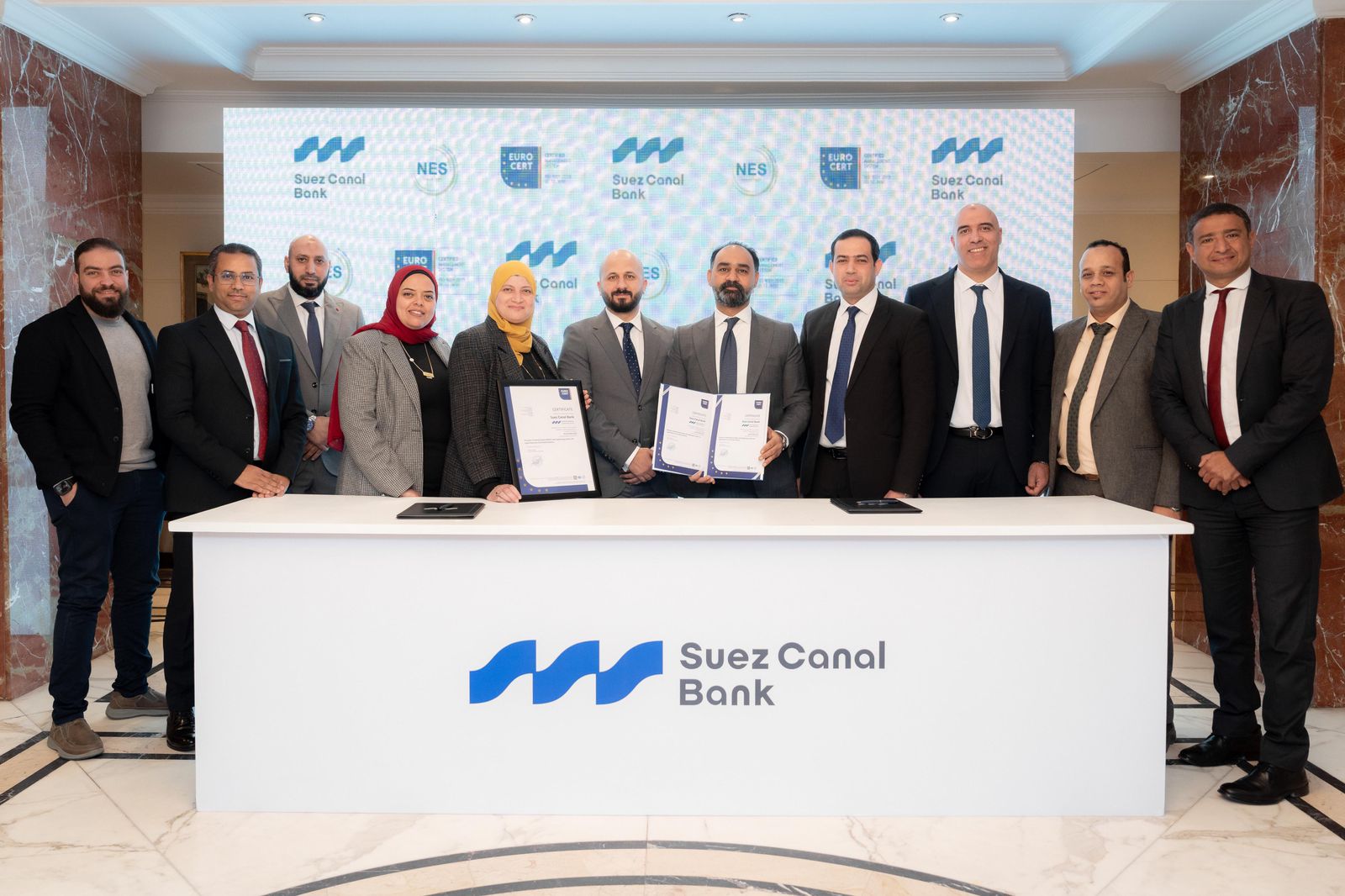 يأتي ذلك وفقًا للمعايير والمواصفات الدولية المعتمدة في هذا المجال، في إطار احتفالية رسمية بمقر بنك قناة السويس، وقام بتسليم الشهادة كلّ من السفير نيكولاوس باباجورجيوس، سفير اليونان والملحق الاقتصادي والتجاري في مصر.