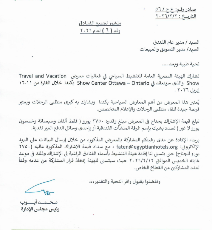 وأوضح المستند أن قيمة الاشتراك بجناح المعرض تبلغ 2,750 يورو، وتسدد بشيك باسم غرفة المنشآت الفندقية، أو بإحدى وسائل الدفع غير النقدية، مع آخر موعدٍ للسداد الخميس الـ12 من نوفمبر الجاري.
