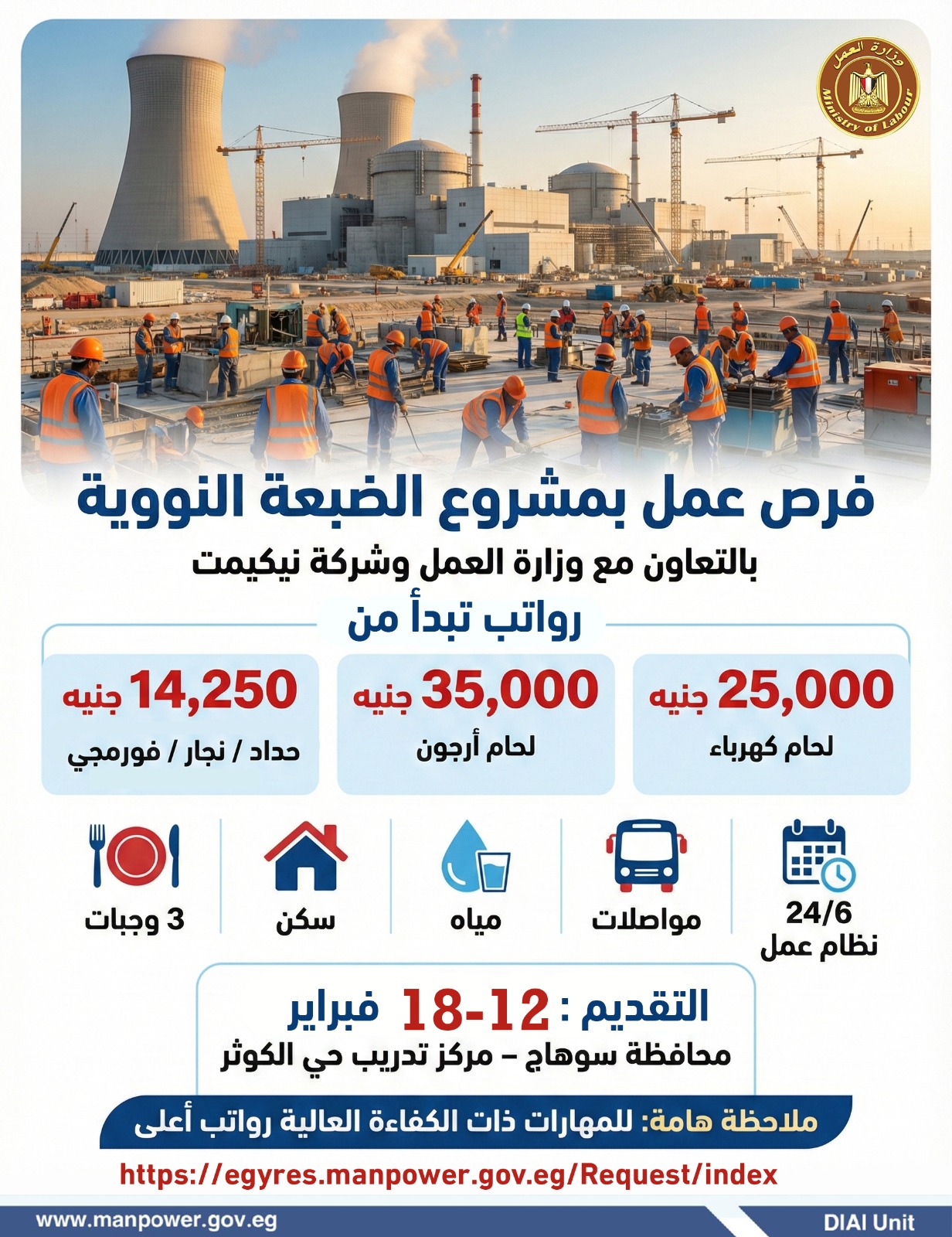 أعلنت وزارة العمل، بالتعاون مع شركة «نيكيمت» إحدى شركات مشروع الضبعة النووية، عن فتح باب التقديم والاختبارات لشغل عدد من فرص العمل الفنية بالمشروع، وذلك بمحافظة سوهاج خلال الفترة من الخميس الـ12 من فبراير 2026، وحتى الأربعاء الـ18 من نفس الشهر 2026، باستثناء يومي الجمعة والسبت، تنفيذا لتوجيهات وزير العمل محمد جبران، بتوفير فرص عمل للشباب.