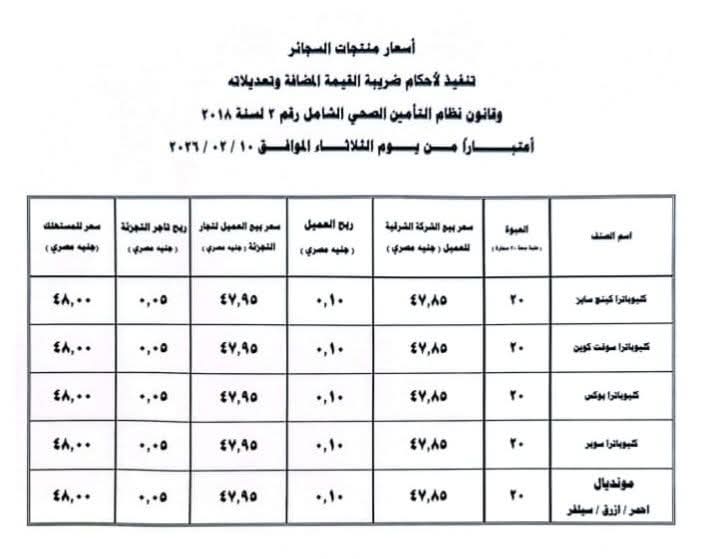 ينشر موقع "إيجي إن" أسعار السجائر، بعد إعلان الزيادة الجديدة، وفقا لتنفيذ أحكام ضريبة القيمة المضافة وتعديلاته، وقانون نظام التأمين الصحي الشامل رقم 2 لسنة 2018، والتي من المقرر أن تطبق غدًا الثلاثاء الموافق 10 / 2 / 2026.