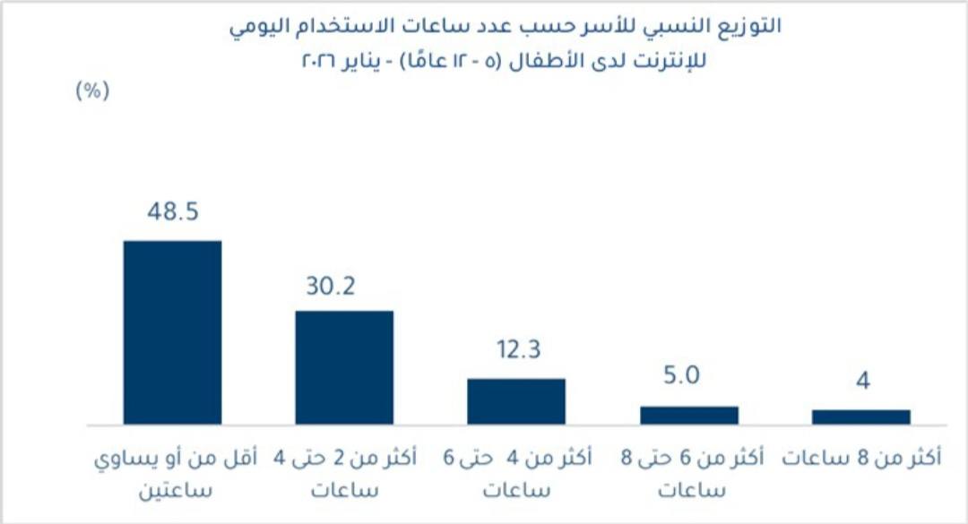 أظهرت النتائج أن 48.5% من الأطفال (من سن 5 إلى 12 عاماً) يقضون أقل من ساعتين يومياً على الإنترنت، بينما يقضي 4% منهم أكثر من 8 ساعات.