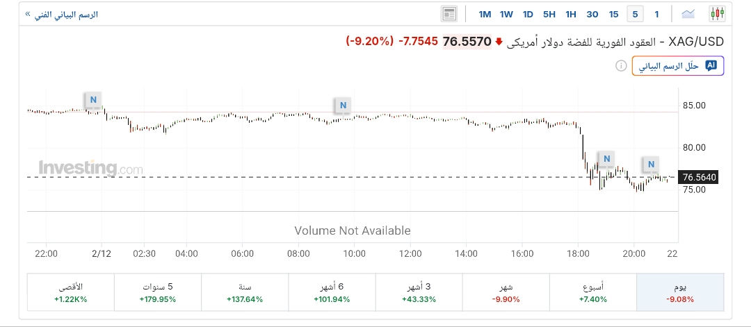 وبذلك يكون المستثمر الذي اشترى الفضة عند مستوى 121 دولارًا، قد تكبد خسارة تقارب 45 دولارًا في الأوقية الواحدة، أي ما يعادل نحو 37% من قيمة استثماره خلال أقل من ثلاثة أسابيع.