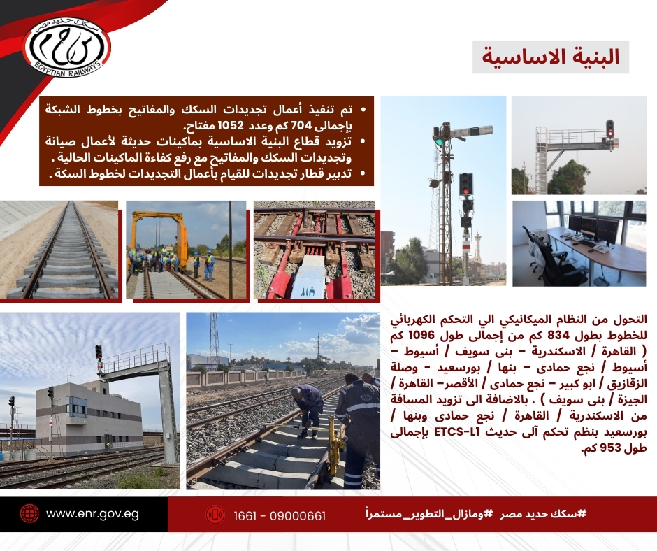 استعرضت الهيئة القومية للسكك الحديدية أبرز مشروعات التطوير التي توليها الدولة أهمية في القطاع السككي، مؤكدة أنها تواصل جهودها لتطوير قطاعات البنية الأساسية للسكك الحديدية، في إطار استراتيجية شاملة تهدف إلى تحديث الشبكة ورفع كفاءتها وتحسين مستوى السلامة والخدمات المقدمة للمواطنين.