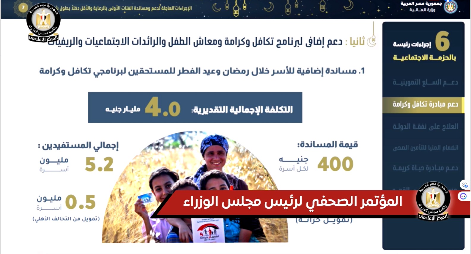 كشف أحمد كجوك، وزير المالية، أن الدعم الإضافي لبرنامج تكافل وكرامة ومعاش الطفل والرائدات الاجتماعيات والريفيات، سيكون مساندة إضافية للأسر خلال رمضان وعيد الفطر للمستحقين لبرنامجي تكافل وكرامة.