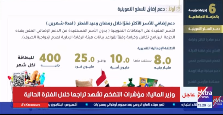ولذلك، تبدأ الدولة ببعض الإجراءات في فترة مؤقتة برمضان والعيد، كصرف 400 جنيه دعم إضافي لـ10 ملايين بطاقة تموينية، لحوالي 25 مليون فرد، وبحوالي 8 مليار جنيه ولمدة شهرين فقط، حتى تحصل الأسرة صاحبة البطاقة على الاستفادة من هذه الحزمة.