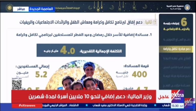 وأكد أن برنامج تكافل وكرامة يزيد عن 5 ملايين أسرة وهناك استقرار في البرنامج ويعمل بكفاءة، كما نستهدف إتاحة 400 جنيه لكل مستفيد في هذا البرنامج مثل البطاقات التموينية، ويشمل ذلك 5.2 مليون أسرة، ولفترة مؤقتة أيضًا تصل إلى شهرين فقط، لتكون التكلفة الإجمالية 4 مليارات جنيه.