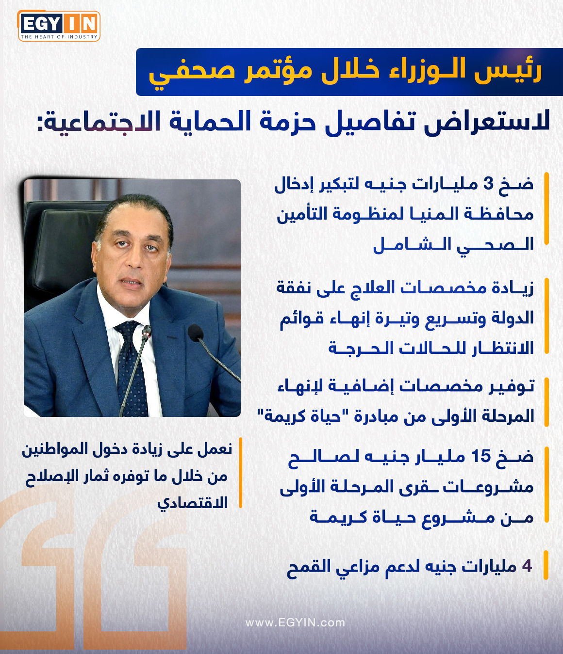 وينشر موقع «إيجي إن» إنفوجراف حول أبرز تصريحات رئيس الوزراء حول تفاصيل حزمة الحماية الاجتماعية.