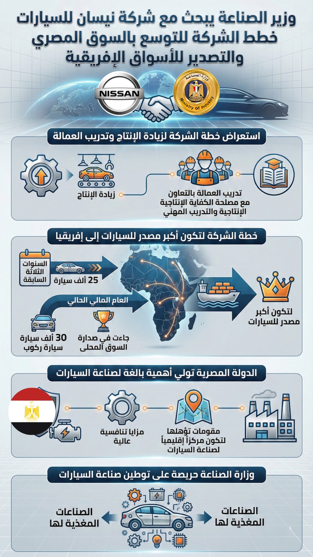 وبحث وزير الصناعة مع ممثلي شركة نيسان خطط توسعها في السوق المصرية، إلى جانب التصدير للأسواق الأفريقية.