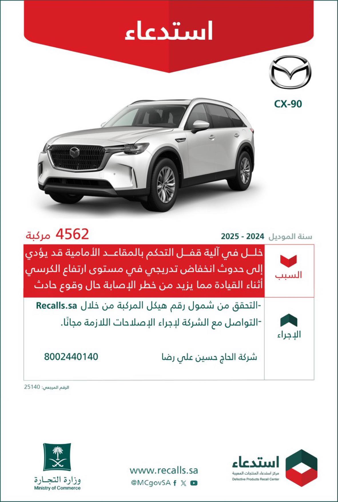 أعلنت وزارة التجارة السعودية استدعاء 4,562 مركبة من طراز مازدا CX-90 موديلات عامي 2024 و2025، بسبب وجود خلل في آلية قفل التحكم بالمقاعد الأمامية قد يؤدي إلى حدوث انخفاض تدريجي في مستوى ارتفاع الكرسي أثناء القيادة مما يزيد من خطر الإصابة حال وقوع حادث.