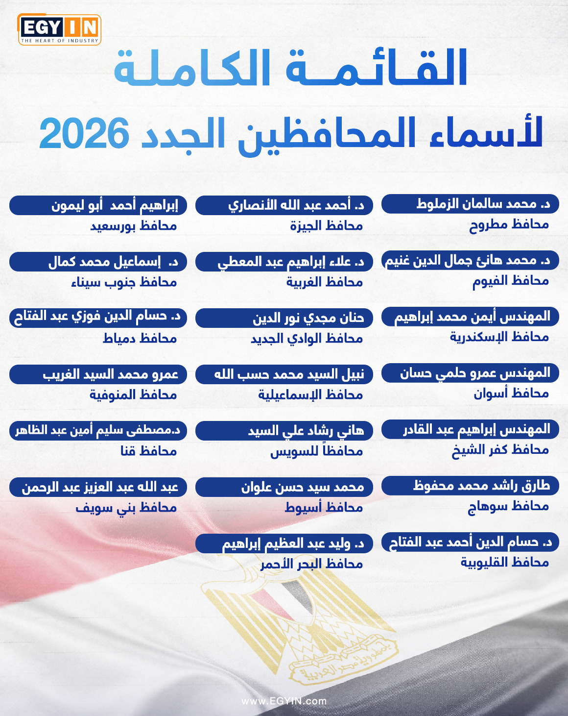 ويستعرض موقع "إيجي إن" من خلال الانفوجراف التالي القائمة الكاملة بأسماء المحافظين الجدد لعام 2026.