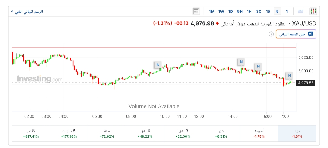 وهبطت الأسعار الفورية للذهب بنسبة 1.3%، ليتم تداولها حاليًا عند 4,976 دولارًا للأوقية، بعدما افتتحت التداولات عند 5,043 دولارًا، مسجلة أعلى مستوى لها عند 5,043 دولارًا، في حركة تقلبات حادة ما بين صعود وهبوط، وذلك بعد أن سجل ارتفاعًا لمستوى غير مسبوق عند 5,595 دولارًا في الـ29 من يناير الماضي، بحسب موقع «إنفيستينج».