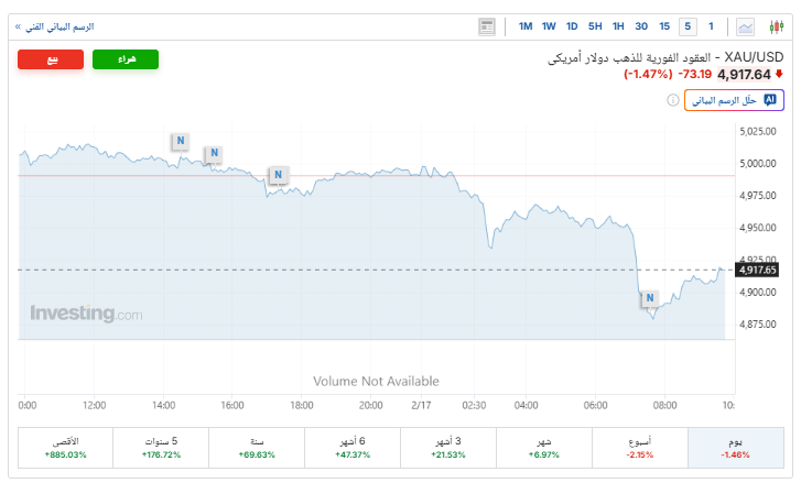 وهبطت الأسعار الفورية للذهب بنسبة 1.4%، ليتم تداولها حاليًا عند 4,917 دولارًا للأوقية، بعدما افتتحت التداولات عند 4990 دولارًا، مسجلة أعلى مستوى لها عند 5 آلاف دولار، في حركة تقلبات حادة ما بين صعود وهبوط، وذلك بعد أن سجل ارتفاعًا لمستوى غير مسبوق عند 5,595 دولارًا في الـ29 من يناير الماضي، بحسب موقع «إنفيستينج».