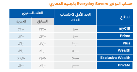 خفض بنك CIB أسعار الفائدة على حساب التوفير اليومي بالجنيه المصري Everyday Savers، على أن يكون العائد السنوي الجديد كالتالي:
